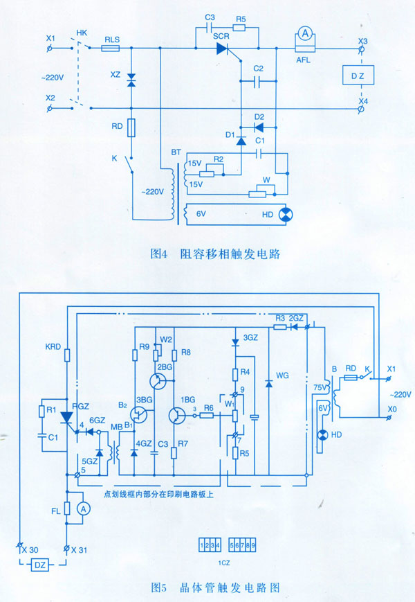 圖4所示為阻容移相角撥電路原理圖,圖5所示為晶體管觸發(fā)電路原理。其它如需各種 形式的自動控制電控箱,可按要求制作。七、隨機技術(shù)文件